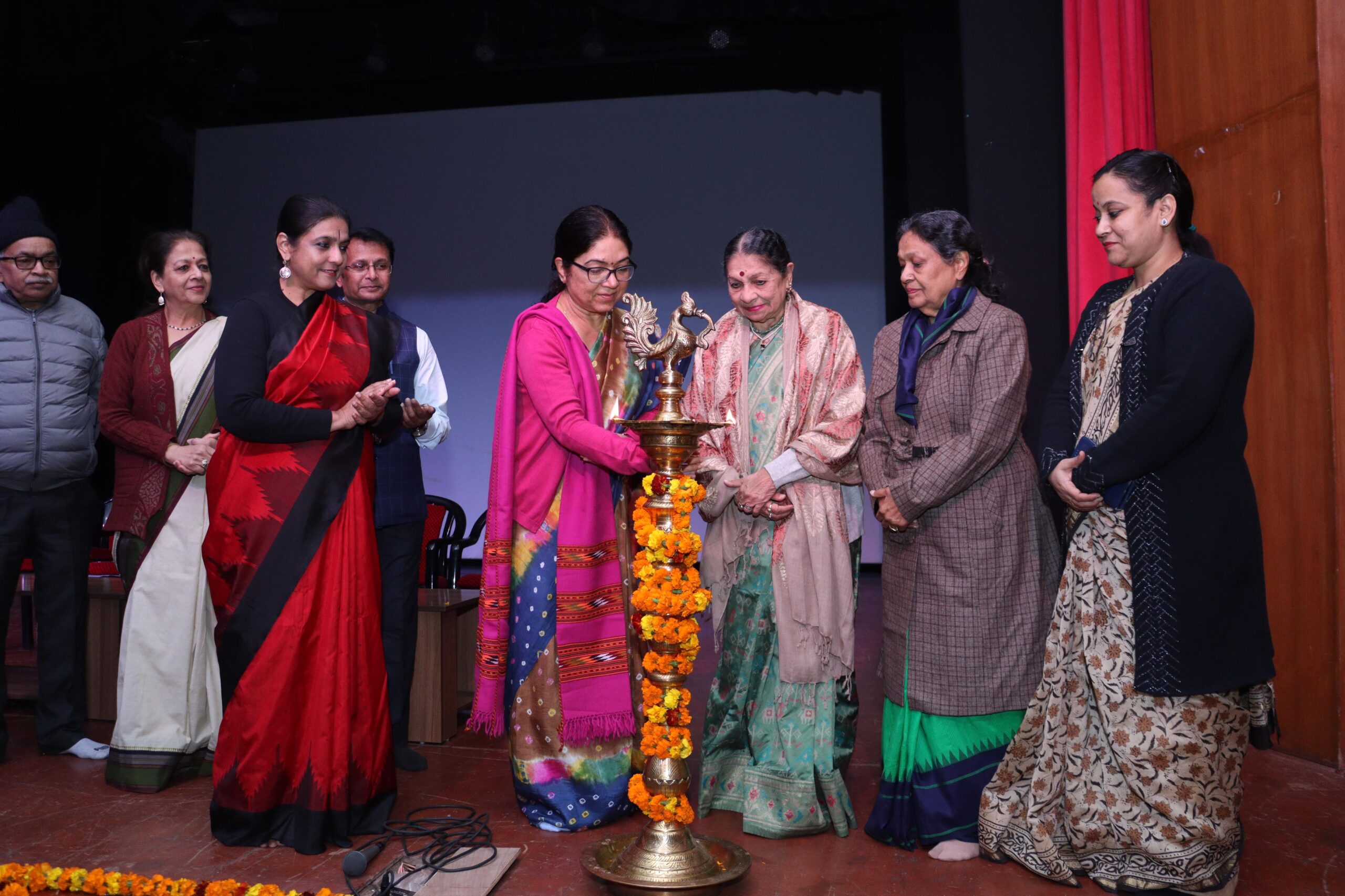 The inaugural session, titled “Sharngadev Prasang”, began with the ceremonial lighting of the lamp by Vice-Chancellor Prof. Mandavi Singh, Padma Shri Darshana Jhaveri, former Vice-Chancellor Prof. Poornima Pandey, Director of Mahagami Gurukul Parvati Dutta, Head of the Vocal Music Department Prof. Srishti Mathur, Head of the Percussion Department Dr. Manoj Mishra, Head of the Dance Department and Programme Convenor Gyanendra Datt Bajpai, along with Dr. Ruchi Khare and Renu Sharma.