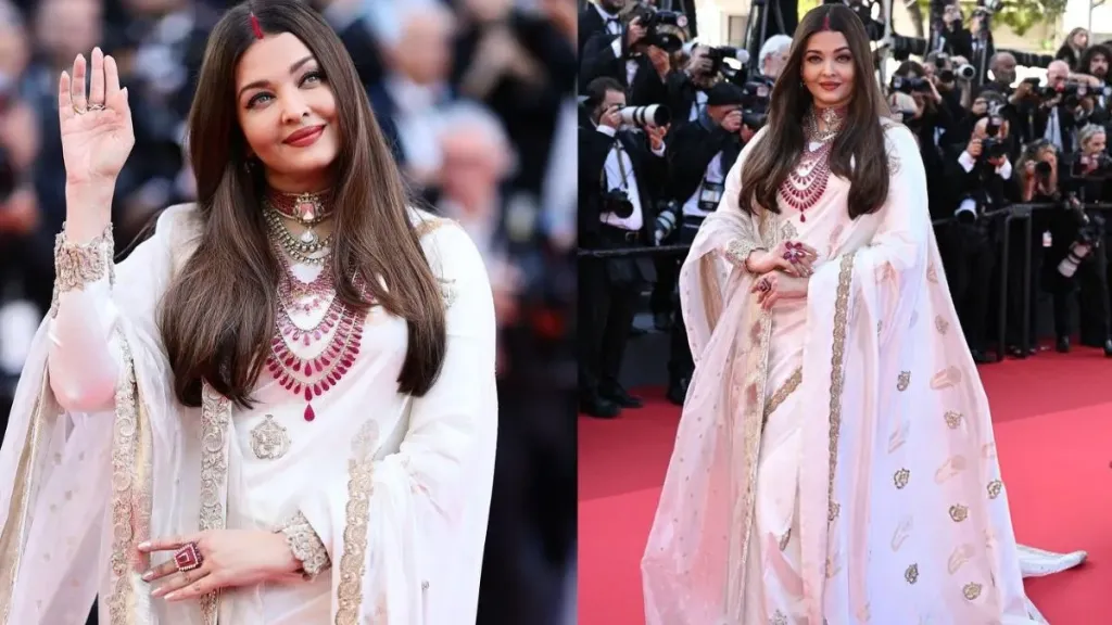 London: Aishwarya Rai Bachchan made a spectacular return to the Cannes red carpet, effortlessly blending Indian tradition with contemporary glamour. Draped in an exquisite white Banarasi sari crafted by Manish Malhotra, she looked every bit the epitome of grace and elegance. However, it was her breathtaking 500-carat ruby necklace that truly captivated attention, perfectly complementing the vibrant red of her sindoor and symbolizing her joyous married life.