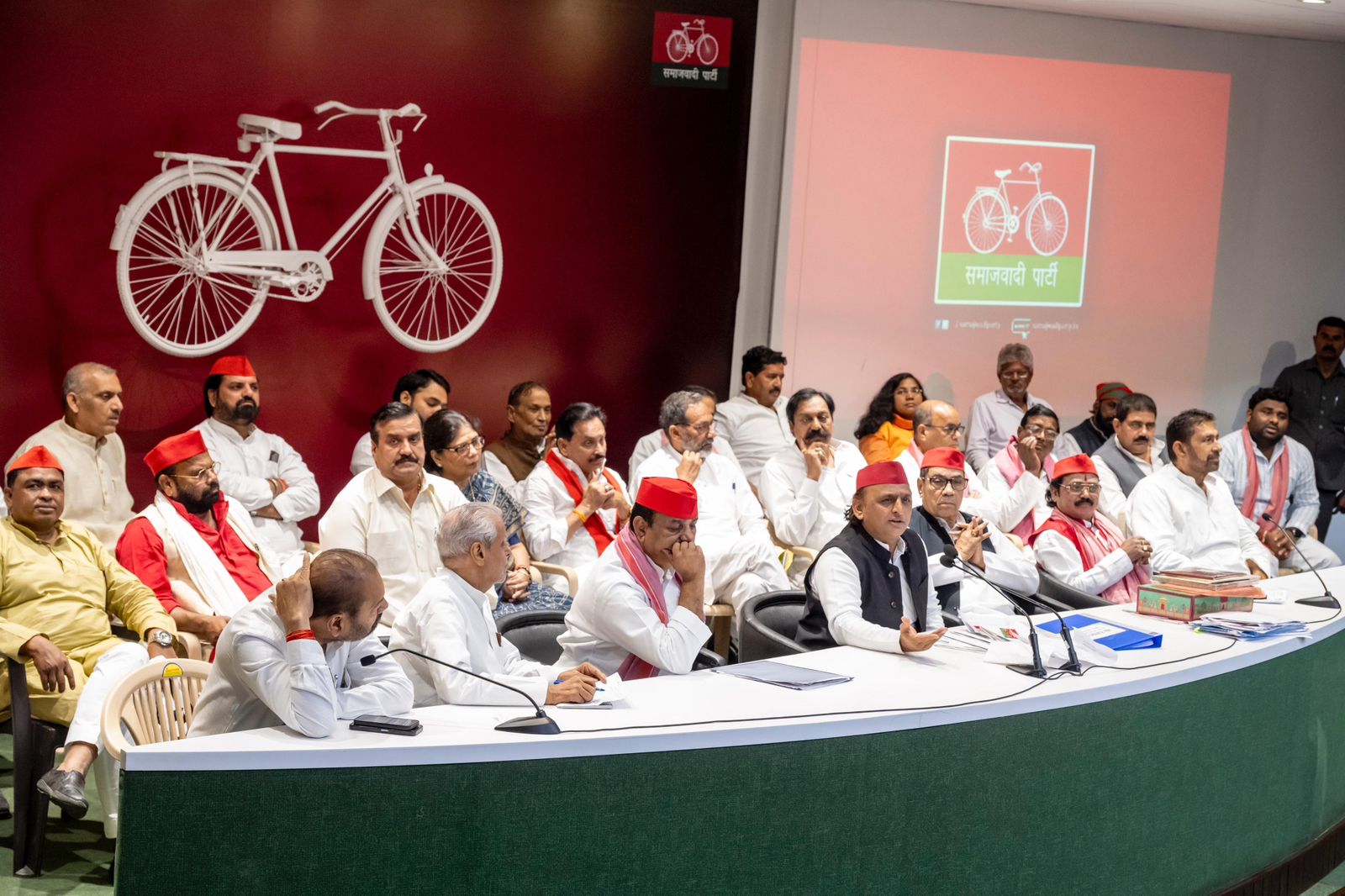 Senior SP leaders including National Vice President Kiranmoy Nanda, National Secretary and former minister Rajendra Chaudhary, State President Shyam Lal Pal, MP Chhotelal Kharwar, and several MLAs and workers were present in large numbers.