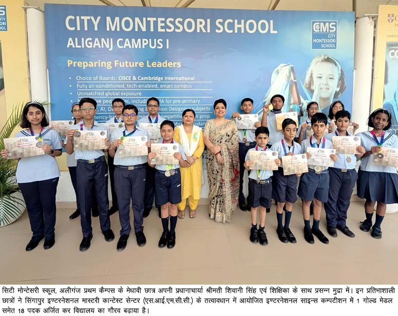 Lucknow : The meritorious students of City Montessori School, Aliganj Campus I, have brought glory to Lucknow on the international stage by winning a total of 18 medals including 1 Gold Medal, 4 Silver Medals, and 13 Bronze Medals in the International Science Competition (VANDA-2025) organized under the aegis of Singapore International Mastery Contest Centre (SIMCC). In addition, 16 students were awarded certificates of appreciation for their outstanding performance. In this prestigious competition, Aarav Kumar Singh, a Class 8 student of CMS Aliganj Campus I, secured National Rank 3 and…