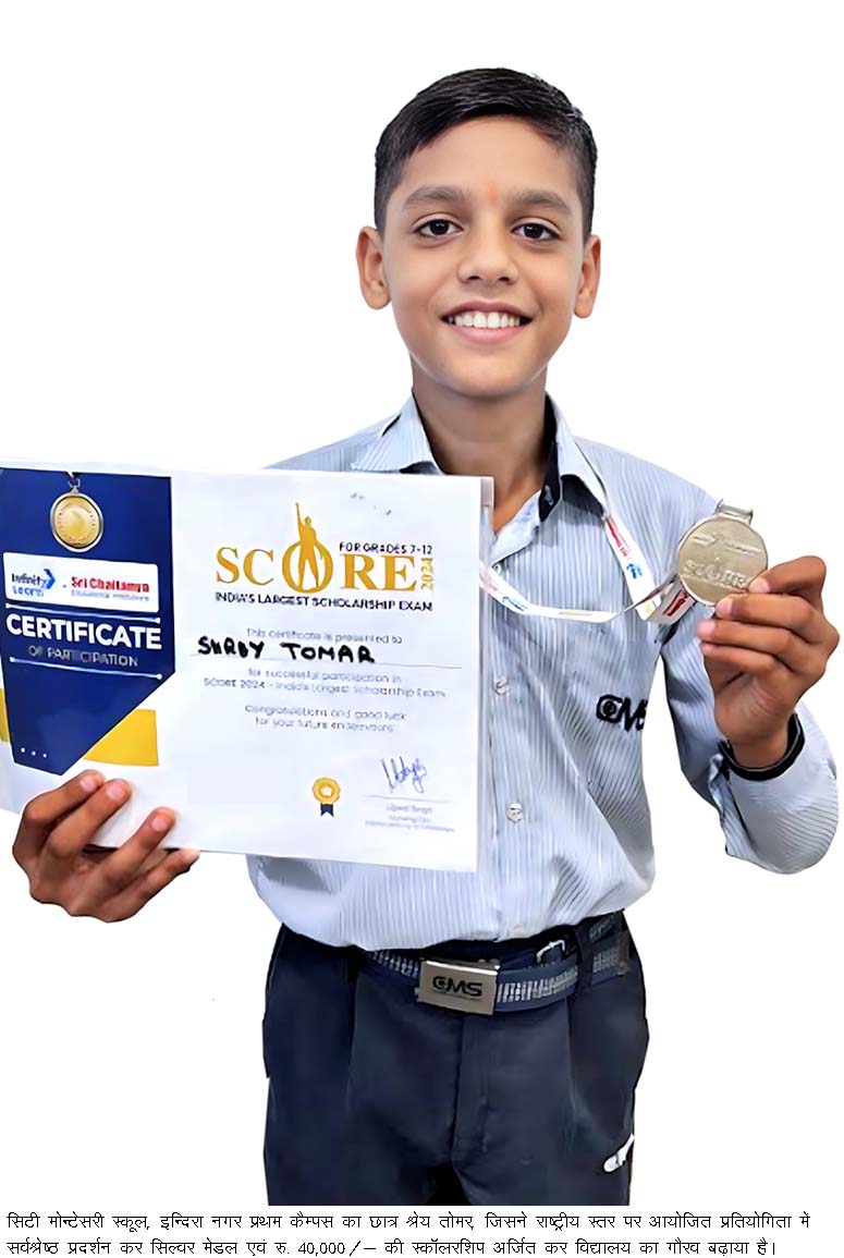 Lucknow : Shrey Tomar, a meritorious student of Class 8 from City Montessori School, Indira Nagar Campus I, has brought glory to the school by winning a Silver Medal and a scholarship of Rs. 40,000/- at the national level due to his brilliance and academic excellence. Shrey Tomar earned this distinction through his outstanding performance in the national-level scholarship examination ‘SCORE-2024’, which was organized by Infinity Learn under the aegis of Sri Chaitanya Educational Institutions.