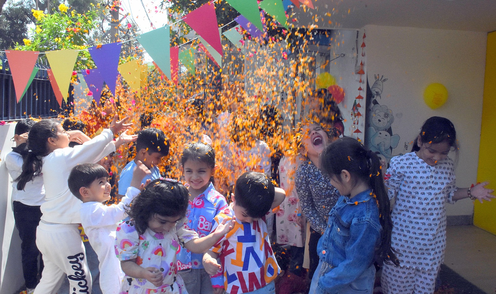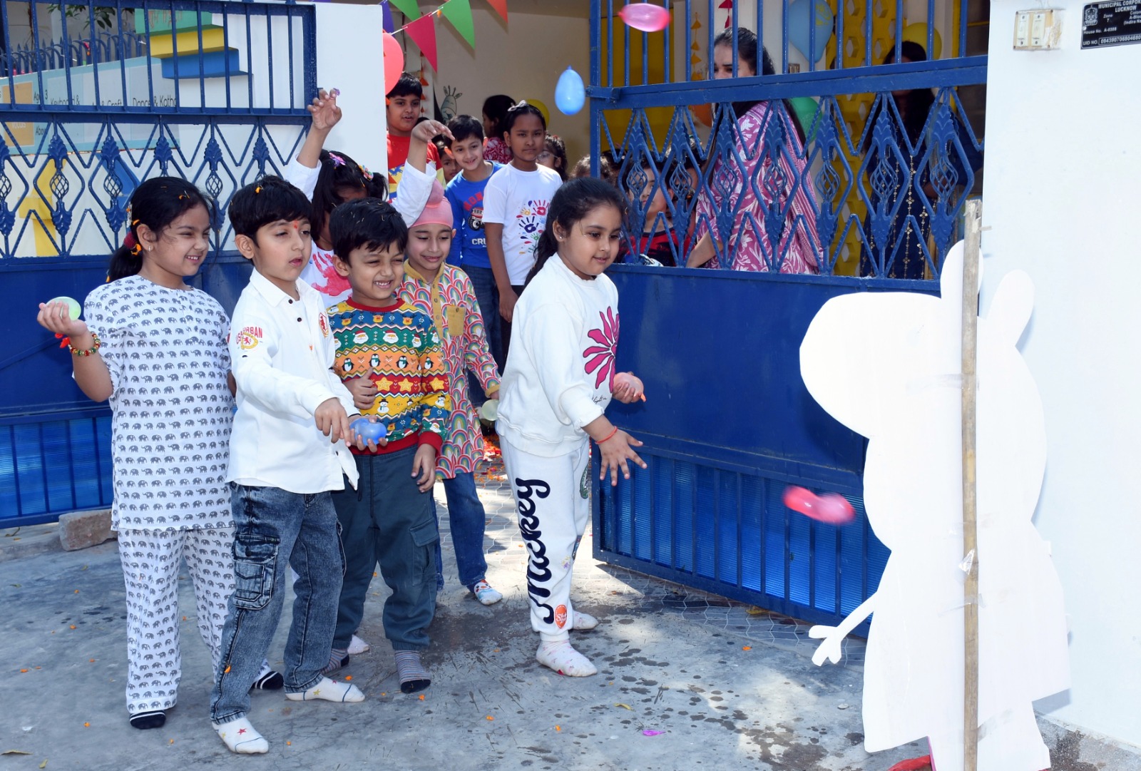 Adding to the festive charm, the ‘Phoolon Ki Holi’ segment had participants drenched in a shower of marigold and rose petals, an experience that recreated the grandeur of Holi celebrations in temples of Vrindavan and Mathura. The energy reached its peak during the balloon-hitting activity, where children gleefully aimed at a giant Peppa Pig installation, bursting balloons filled with vibrant colours.