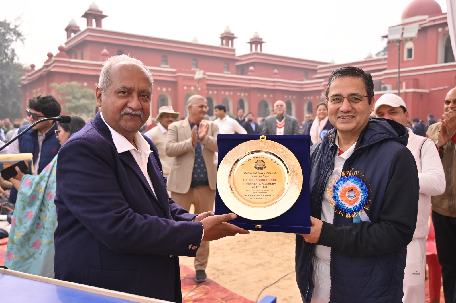 The morning unfolded on a warm and emotional note with the welcome and felicitation of the Chief Guest, Dr. Shantanu Pande, Senior Cardiologist at SGPGIMS, Lucknow, and Guest of Honour, Amitabh Arya, Department of Nuclear Medicine, SGPGIMS, Lucknow—both distinguished Ex-Colvinians. They were felicitated by Principal Mr. Sachidanand Singh, whose words reflected pride in seeing alumni return to the campus that shaped their formative years. The guests expressed heartfelt joy at being back on familiar turf, witnessing a match that symbolised the enduring bond between past and present.