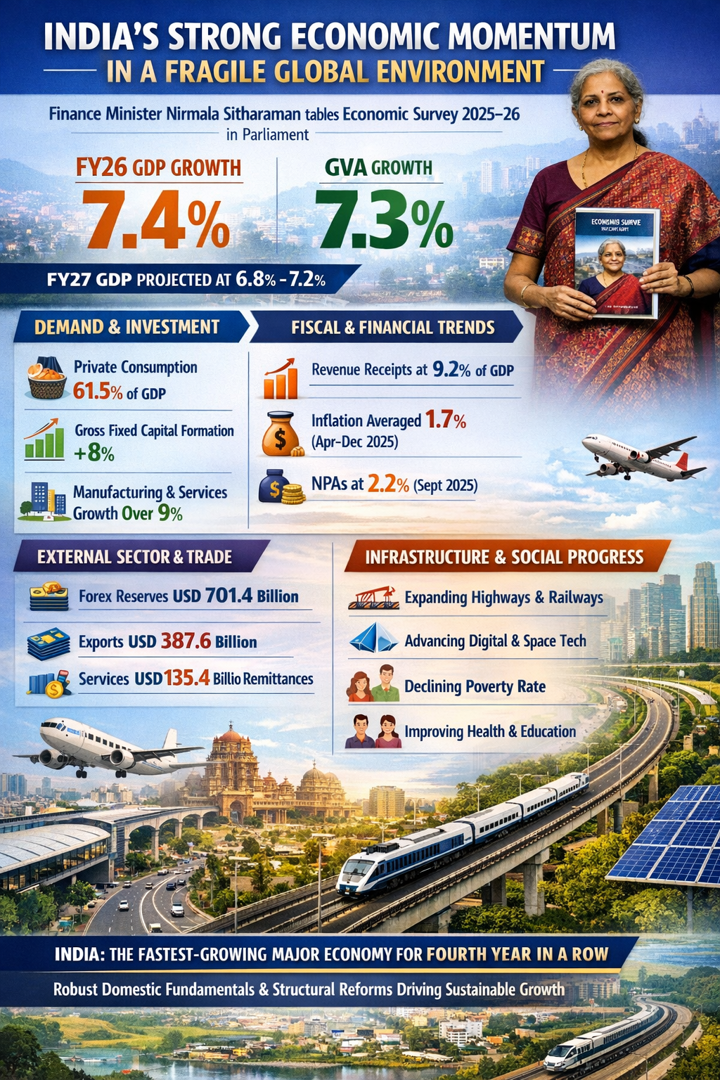 Overall, the Survey concludes that India’s growth is increasingly driven by strong domestic fundamentals, disciplined policy frameworks, and long-term structural reforms—providing stability and confidence amid global uncertainty.