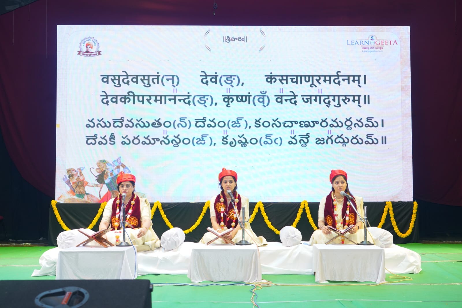 The gathering witnessed a mesmerizing musical recitation of Gita verses by Pooja Bhabhi, Jyoti Didi, and Rupal Didi. Their melodious chanting filled the auditorium with spiritual vibrancy.