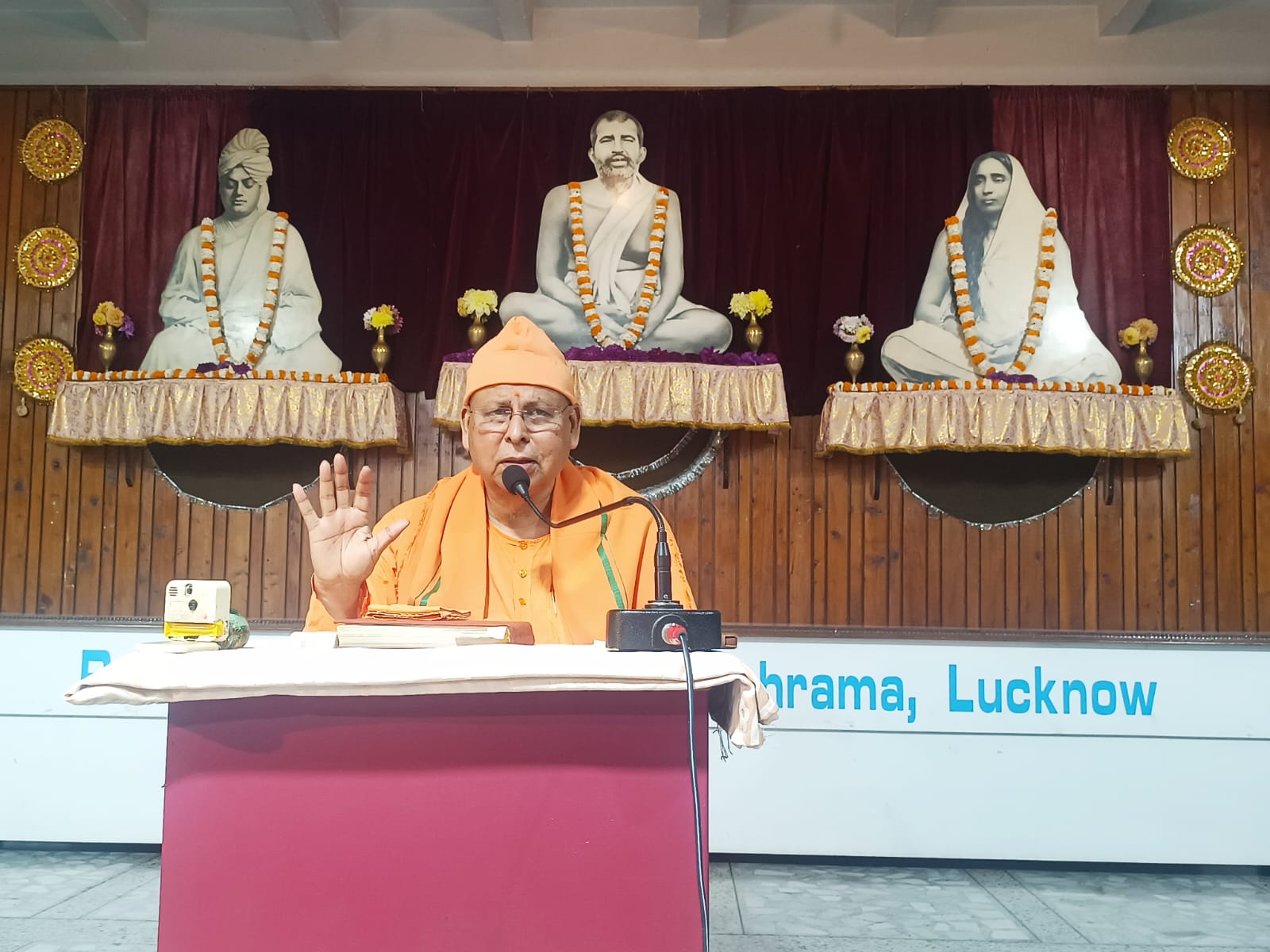 Lucknow: In his weekly Sunday discourse on the Ramakrishna Vachanamrit, Swami Muktinathananda, Adhyash of Ramakrishna Math, Lucknow, said that the story of Lord Krishna’s birth is extremely sacred and inspiring. He was born in the prison of Kansa in Mathura. Kansa, Devaki’s brother, was terrified after hearing a divine voice that he would die at the hands of Devaki’s eighth son. Fearing this, he imprisoned Devaki and her husband Vasudeva and killed their six sons. When Krishna was born as the eighth son, a miraculous miracle occurred. The prison doors opened on their own, the guards fell asleep, and Vasudeva, carrying the newborn Krishna, crossed the Yamuna River and reached Gokul. There, he left Krishna at the home of Nanda Baba and Yashoda and returned to prison with their newborn daughter.