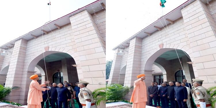 Lucknow— On the occasion of India’s 79th Independence Day, Uttar Pradesh Chief Minister Yogi Adityanath hoisted the national flag at his official residence in Lucknow, extending heartfelt greetings to the people of the state. He paid solemn tribute to the great heroes of the freedom struggle who freed the nation from centuries of colonial rule, describing independence as the result of the sacrifices, dedication, and struggles of Mahatma Gandhi and countless revolutionaries who united the country from north to south and east to west.