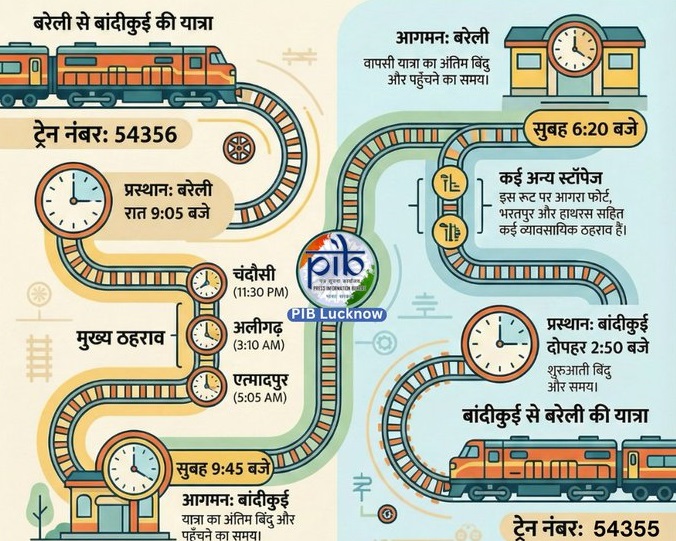 Lucknow: The Ministry of Railways has approved the introduction of a new passenger train service between Bareilly and Bandikui, aimed at improving rail connectivity across Uttar Pradesh and adjoining regions. The service will operate as the Bareilly–Bandikui Passenger with train numbers 54356 and 54355.