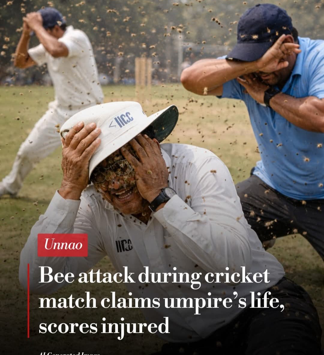 Today (19 February 2026), an umpire died after a bee attac hok during a cricket match in the Kanpur–Unnao region of Uttar Pradesh. 65-year-old umpire Manik Gupta was officiating in a local cricket match.