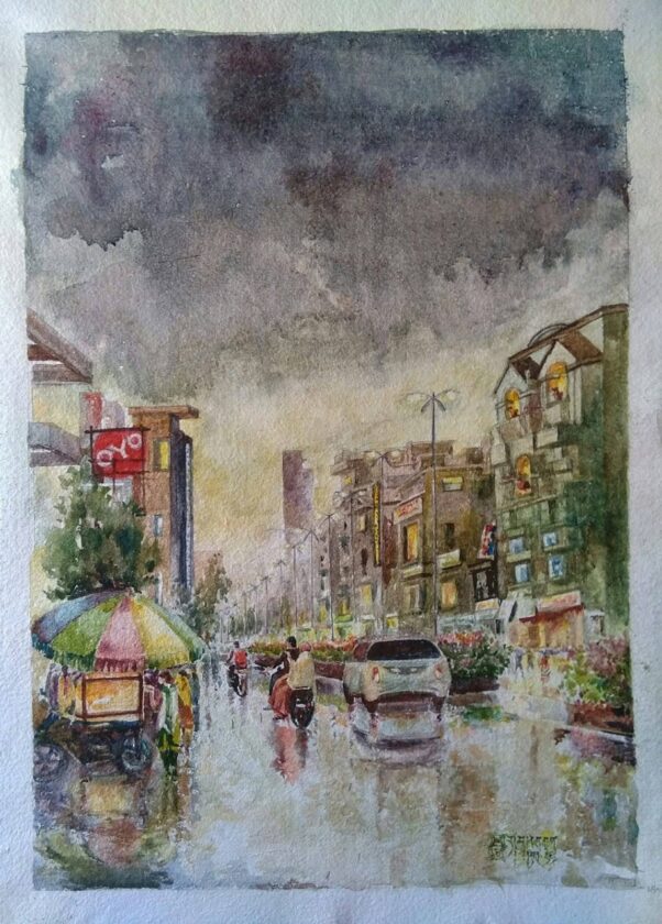 Prof. Jaiswal was especially renowned for his mastery in watercolour and wash techniques. Transparency, flow, restraint and deep sensitivity were hallmarks of his visual language. His works were exhibited widely in major art centres including Jaipur, Lucknow, Delhi, Mumbai, Chandigarh, Goa, Shimla, Ahmedabad and Ajmer. He actively participated in numerous state and national-level art camps and exhibitions. He received several awards from Lalit Kala Parishad, Lucknow, and Rajasthan Lalit Kala Akademi. In 1997, the Rajasthan Lalit Kala Akademi honoured him with its highest recognition, the Kalavid award. He was also conferred with prestigious honours such as Kala Ratna, Vayovriddha Kalakar Samman, Nagari Das Samman and Sanskar Bharati Samman. His paintings form part of national and state art galleries as well as important private collections.