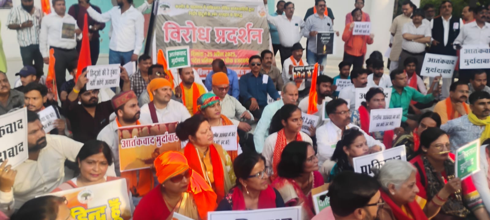 A large number of men and women activists from the Vishwa Hindu Parishad, Bajrang Dal, Durga Vahini, and Matrishakti gathered at the venue. They held placards with slogans like “Pakistan Murdabad,” “Islamic Jihad Murdabad,” and “Terrorism Murdabad,” and chanted anti-Pakistan and anti-terrorism slogans. The activists also paid their respects to the Hindus who lost their lives in the tragic incident.